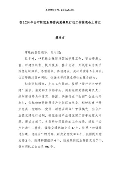 【七哥公文】2024年:在2024年全市新就业群体关爱凝聚行动工作推进会上的汇报发言 (1)+更多免费公文+VX:QiGeGongWen2024