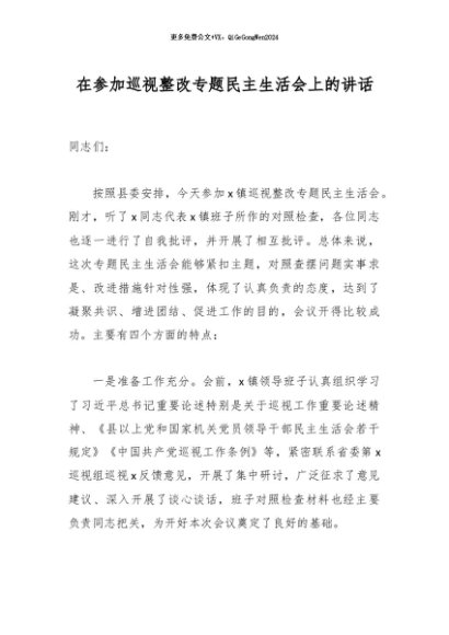 / 【七哥公文】2024年:在参加巡视整改专题民主生活会上的讲话+更多免费公文+VX:QiGeGongWen2024
