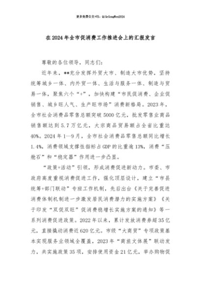 【七哥公文】2024年:在2024年全市促消费工作推进会上的汇报发言 (1)+更多免费公文+VX:QiGeGongWen2024