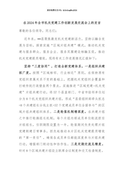 【七哥公文】2024年:在2024年全市机关党建工作创新发展交流会上的发言 (1)+更多免费公文+VX:QiGeGongWen2024