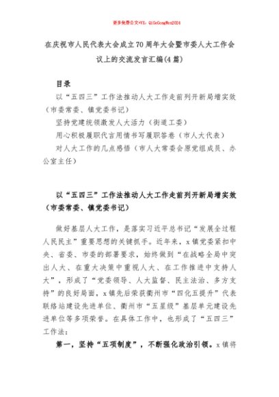 【七哥公文】2024年:在庆祝市人民代表大会成立70周年大会暨市委人大工作会议上的交流发言汇编4篇 (1)+更多免费公文+VX:QiGeGongWen2024