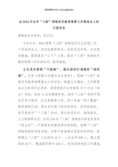 【七哥公文】2024年:在2024年全市“三新”领域党员教育管理工作推进会上的汇报发言 (1)+更多免费公文+VX:QiGeGongWen2024