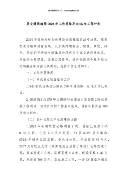 【七哥公文】2024年:县交通运输局2024年工作总结及2025年工作计划+更多免费公文+VX:QiGeGongWen2024