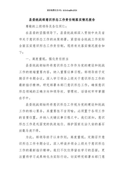 / 【七哥公文】2024年:县委统战部意识形态工作责任制落实情况报告+更多免费公文+VX:QiGeGongWen2024