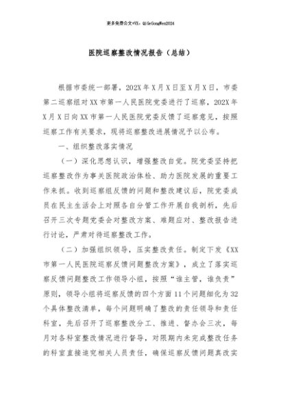 / 【七哥公文】2024年:医院巡察整改情况报告(总结)+更多免费公文+VX:QiGeGongWen2024