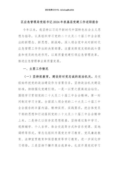 【七哥公文】2024年:区应急管理局党组书记2024年抓基层党建工作述职报告+更多免费公文+VX:QiGeGongWen2024
