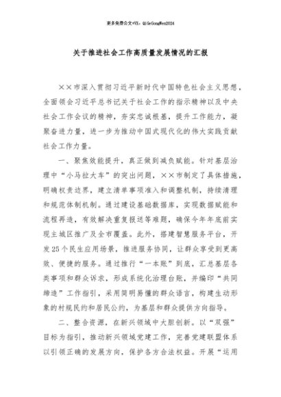 / 【七哥公文】2024年:关于推进社会工作高质量发展情况的汇报+更多免费公文+VX:QiGeGongWen2024