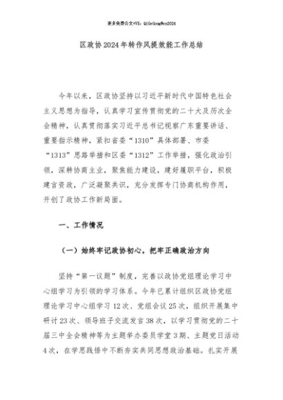/ 【七哥公文】2024年:区政协2024年转作风提效能工作总结+更多免费公文+VX:QiGeGongWen2024