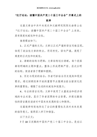 【七哥公文】2024年:“红厅论坛:读懂中国共产党二十届三中全会”开幕式上的致辞+更多免费公文+VX:QiGeGongWen2024