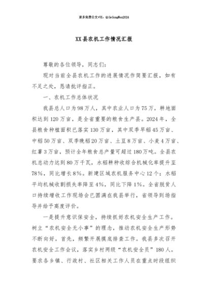 / 【七哥公文】2024年:XX县农机工作情况汇报+更多免费公文+VX:QiGeGongWen2024