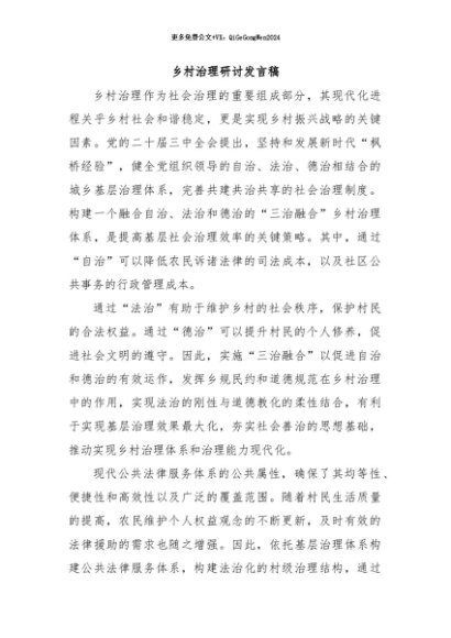 / 【七哥公文】2024年:乡村治理研讨发言稿+更多免费公文+VX:QiGeGongWen2024