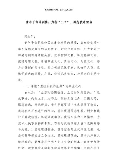 / 【七哥公文】2024年:青年干部培训稿:力行“三心”,践行使命担当+更多免费公文+VX:QiGeGongWen2024
