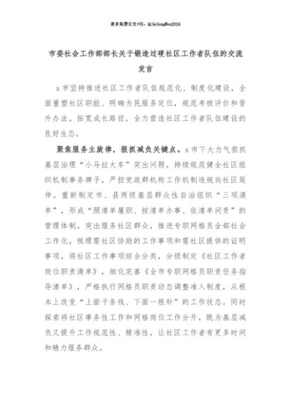 【七哥公文】2024年:市委社会工作部部长关于锻造过硬社区工作者队伍的交流发言+更多免费公文+VX:QiGeGongWen2024