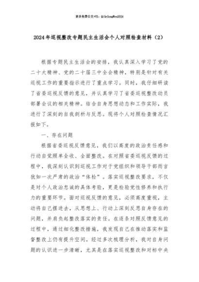 【七哥公文】2024年:2024年巡视整改专题民主生活会个人对照检查材料(2)+更多免费公文+VX:QiGeGongWen2024