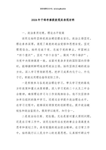 / 【七哥公文】2024年:2024年干部考察提拔现实表现材料+更多免费公文+VX:QiGeGongWen2024