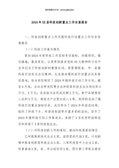 / 【七哥公文】2024年:2024年XX县科技创新重点工作自查报告+更多免费公文+VX:QiGeGongWen2024