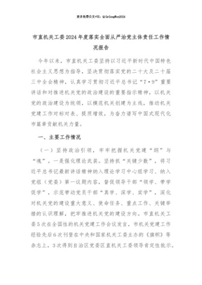 【七哥公文】2024年:市直机关工委2024年度落实全面从严治党主体责任工作情况报告+更多免费公文+VX:QiGeGongWen2024