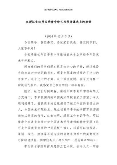 / 【七哥公文】2024年:在浙江省杭州四季青中学艺术节开幕式上的致辞+更多免费公文+VX:QiGeGongWen2024