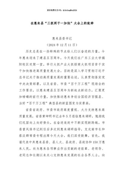 / 【七哥公文】2024年:在惠来县“三抓两干一加快”大会上的致辞+更多免费公文+VX:QiGeGongWen2024
