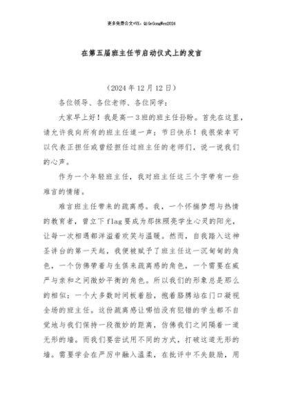 / 【七哥公文】2024年:在第五届班主任节启动仪式上的发言+更多免费公文+VX:QiGeGongWen2024