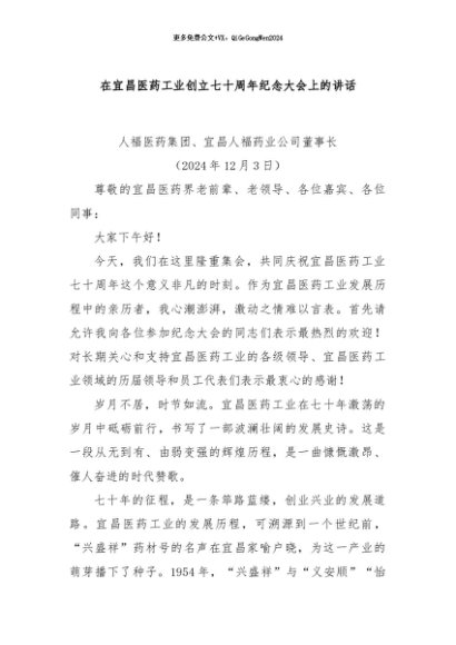 / 【七哥公文】2024年:在宜昌医药工业创立七十周年纪念大会上的讲话+更多免费公文+VX:QiGeGongWen2024