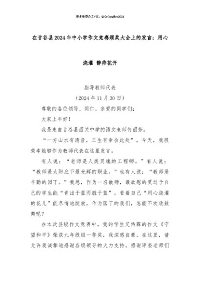 【七哥公文】2024年:在甘谷县2024年中小学作文竞赛颁奖大会上的发言:用心浇灌 静待花开+更多免费公文+VX:QiGeGongWen2024