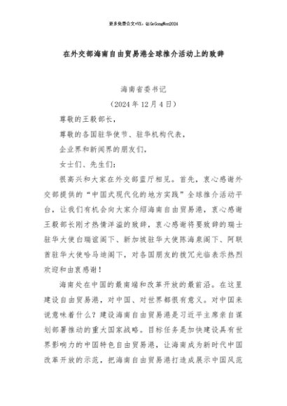 / 【七哥公文】2024年:在外交部海南自由贸易港全球推介活动上的致辞+更多免费公文+VX:QiGeGongWen2024