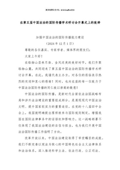【七哥公文】2024年:在第五届中国法治的国际传播学术研讨会开幕式上的致辞+更多免费公文+VX:QiGeGongWen2024