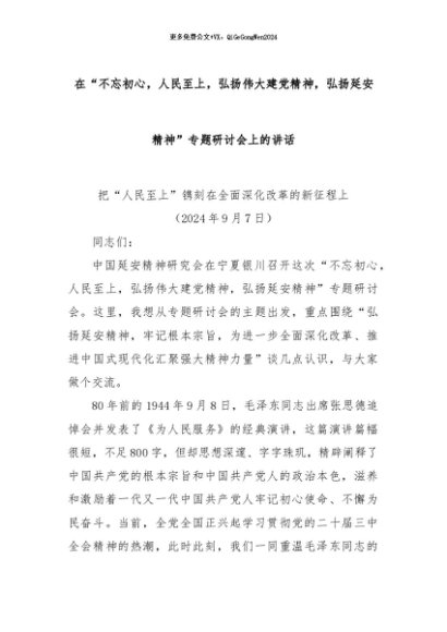 【七哥公文】2024年:在“不忘初心,人民至上,弘扬伟大建党精神,弘扬延安精神”专题研讨会上的讲话+更多免费公文+VX:QiGeGongWen2024
