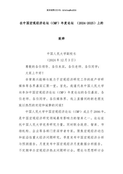 【七哥公文】2024年:在中国宏观经济论坛(CMF)年度论坛 (2024-2025)上的致辞+更多免费公文+VX:QiGeGongWen2024