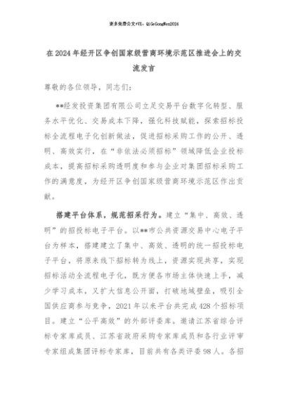 【七哥公文】2024年:在2024年经开区争创国家级营商环境示范区推进会上的交流发言+更多免费公文+VX:QiGeGongWen2024