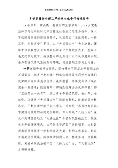 / 【七哥公文】2024年:乡党委履行全面从严治党主体责任情况报告+更多免费公文+VX:QiGeGongWen2024