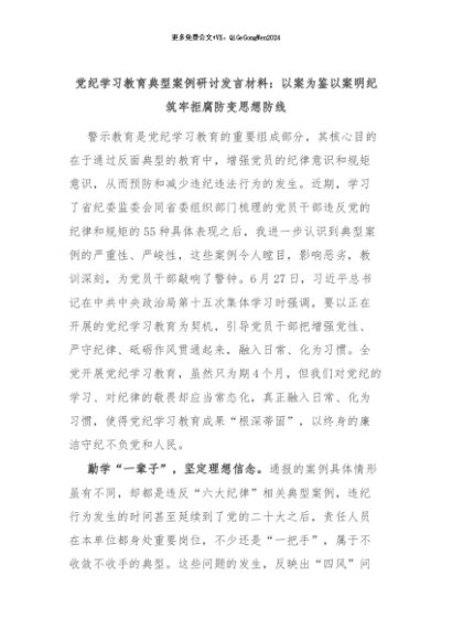 【七哥公文】2024年:党纪学习教育典型案例研讨发言材料:以案为鉴以案明纪 筑牢拒腐防变思想防线+更多免费公文+VX:QiGeGongWen2024