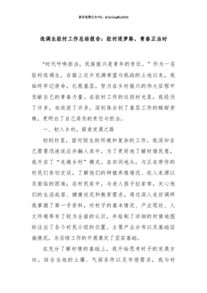 / 【七哥公文】2024年:选调生驻村工作总结报告:驻村逐梦路,青春正当时+更多免费公文+VX:QiGeGongWen2024