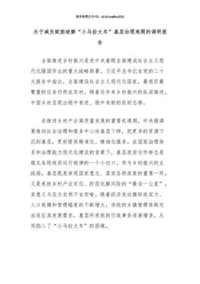【七哥公文】2024年:关于减负赋能破解“小马拉大车”基层治理难题的调研报告+更多免费公文+VX:QiGeGongWen2024