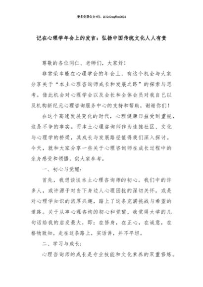/ 【七哥公文】2024年:记在心理学年会上的发言:弘扬中国传统文化人人有责+更多免费公文+VX:QiGeGongWen2024