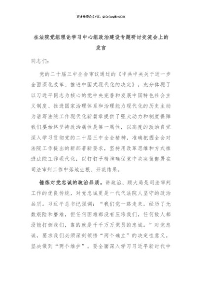 【七哥公文】2024年:法院党组理论学习中心组政治建设专题研讨交流会上的发言+更多免费公文+VX:QiGeGongWen2024