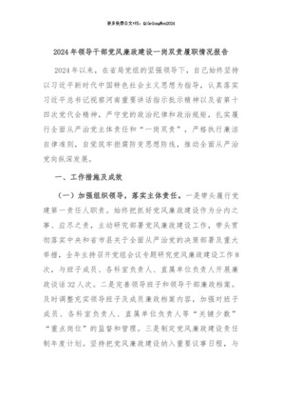 【七哥公文】2024年:2024年领导干部党风廉政建设一岗双责履职情况报告+更多免费公文+VX:QiGeGongWen2024