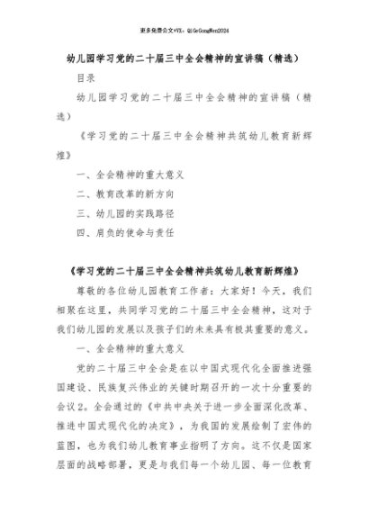 / 【七哥公文】2024年:幼儿园学习党的二十届三中全会精神的宣讲稿(精选)+更多免费公文+VX:QiGeGongWen2024