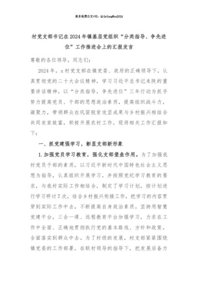 【七哥公文】2024年:村党支部书记在2024年镇基层党组织“分类指导、争先进位”工作推进会上的汇报发言+更多免费公文+VX:QiGeGongWen2024