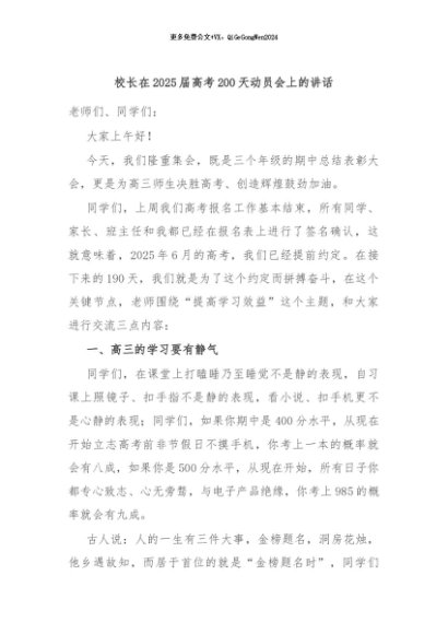 / 【七哥公文】2024年:校长在2025届高考200天动员会上的讲话+更多免费公文+VX:QiGeGongWen2024