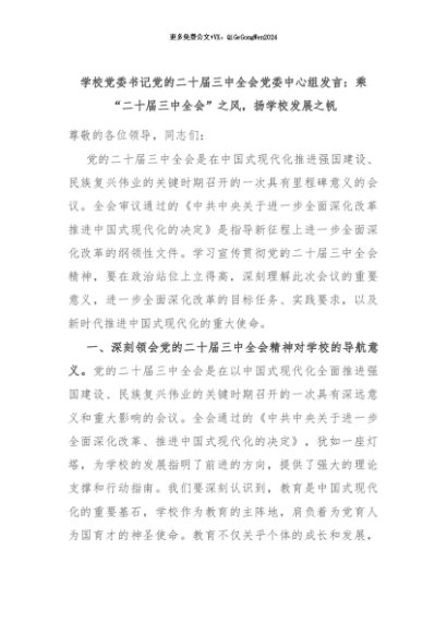 【七哥公文】2024年:学校党委书记党的二十届三中全会党委中心组发言:乘“二十届三中全会”之风,扬学校发展之帆+更多免费公文+VX:QiGeGongWen2024