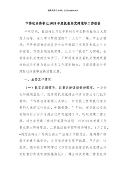【七哥公文】2024年:市委政法委书记2024年度抓基层党建述职工作报告 (1)+更多免费公文+VX:QiGeGongWen2024