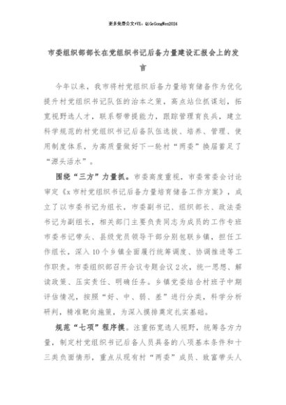 【七哥公文】2024年:市委组织部部长在党组织书记后备力量建设汇报会上的发言+更多免费公文+VX:QiGeGongWen2024