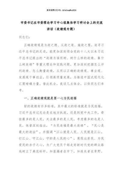 【七哥公文】2024年:市委书记在市委理论学习中心组集体学习研讨会上的交流讲话(政绩观专题)+更多免费公文+VX:QiGeGongWen2024