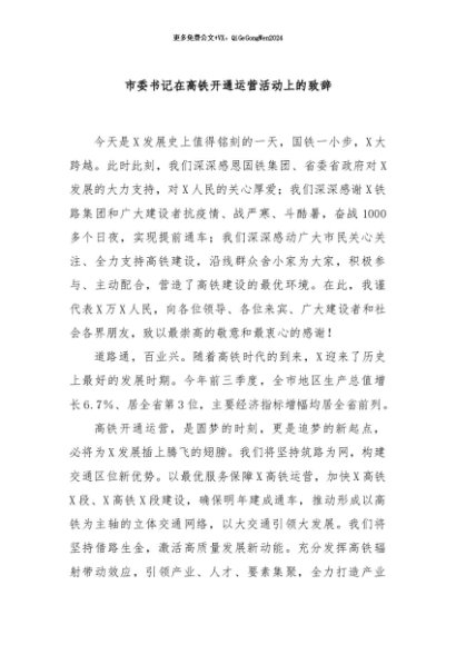 / 【七哥公文】2024年:市委书记在高铁开通运营活动上的致辞+更多免费公文+VX:QiGeGongWen2024