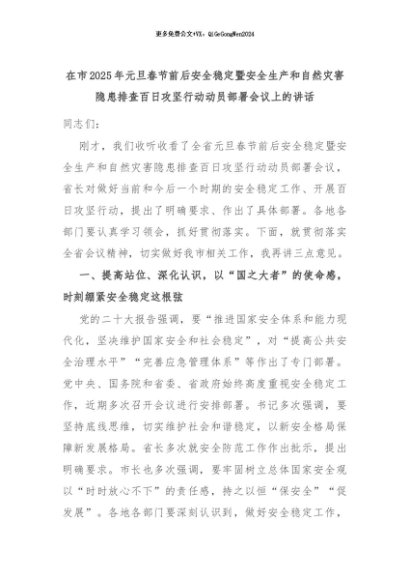 【七哥公文】2024年:在市2025年元旦春节前后安全稳定暨安全生产和自然灾害隐患排查百日攻坚行动动员部署会议上的讲话+更多免费公文+VX:QiGeGongWen2024