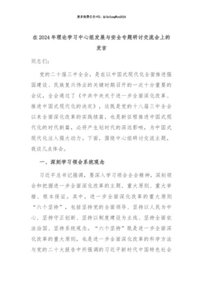【七哥公文】2024年:在2024年理论学习中心组发展与安全专题研讨交流会上的发言+更多免费公文+VX:QiGeGongWen2024