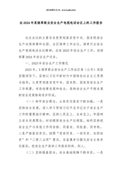 【七哥公文】2024年:在2024年某烟草商业安全生产电视电话会议上的工作报告+更多免费公文+VX:QiGeGongWen2024