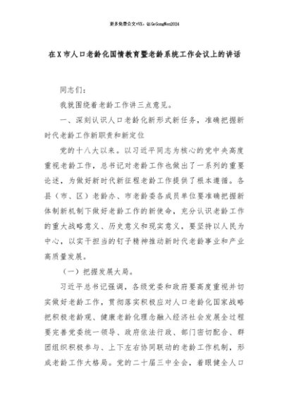 【七哥公文】2024年:在X市人口老龄化国情教育暨老龄系统工作会议上的讲话+更多免费公文+VX:QiGeGongWen2024